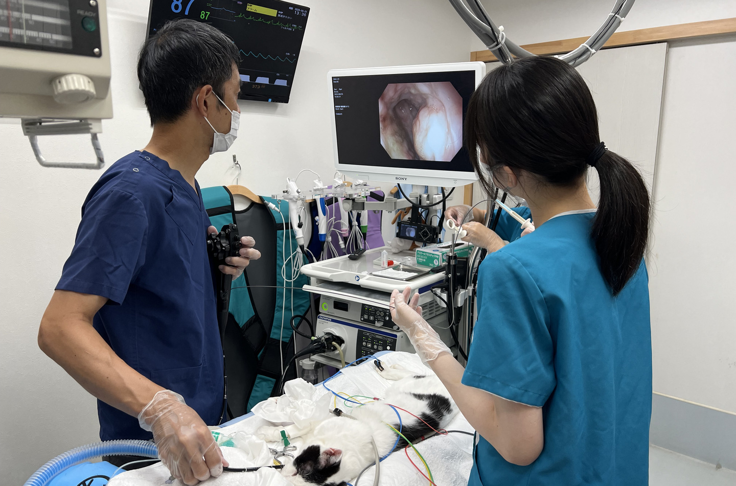 当院では動物に負担の少ない内視鏡検査による胃腸の検査や異物除去などの処置が実施できます。通常のサイズの直径9mmの内視鏡の他に直径5.4mmの細径内視鏡を備えておりいずれもハイビジョン画質対応で、大型犬から仔犬や猫にも適用できます。呼吸器や泌尿器の内視鏡検査も実施可能です。