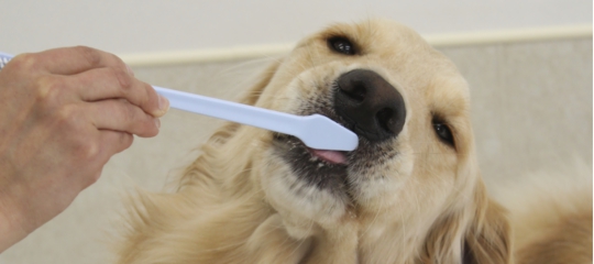当院でも犬猫のデンタルケア専用の様々な用品と取り扱っていますが、中でも犬が飲みこんでも大丈夫でおいしい味のついたハミガキ粉が優れものです。まずはおいしいハミガキ粉で口の中を触らせることに慣れさせましょう。犬が口の中を触られることを喜ぶようになればしめたものです。ハミガキ粉を歯ブラシにつけてゆっくりハミガキを始めましょう。最初は犬が嫌にならない範囲で短時間で留めましょう。犬が嫌がることは飼い主さんにとっても苦痛になりますので長く続きません。