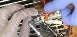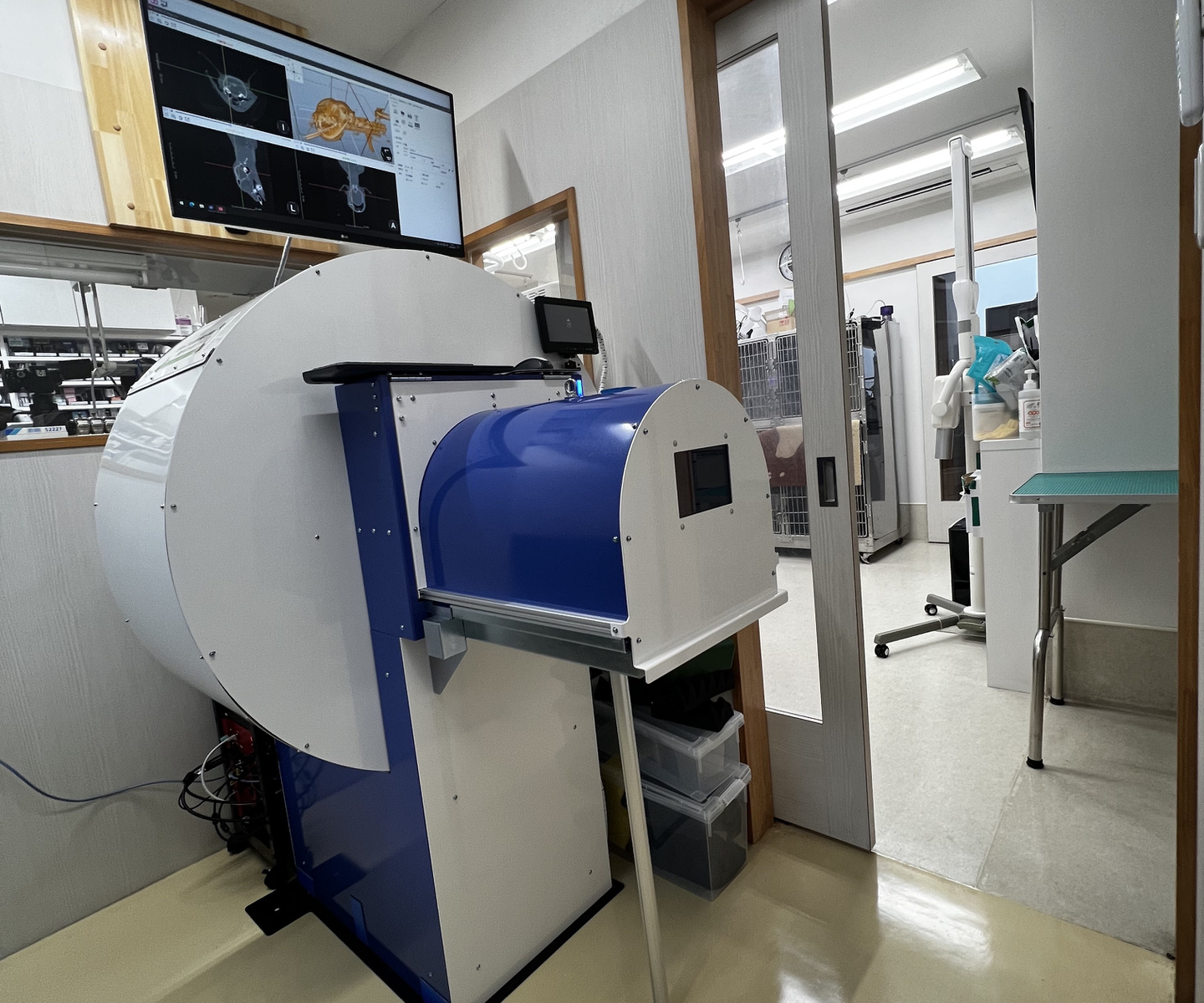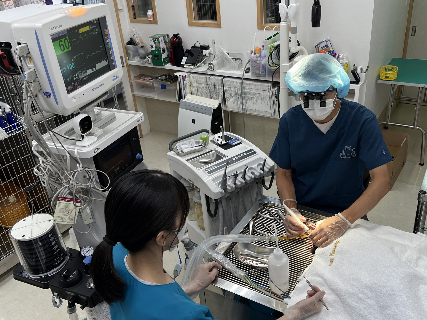歯科処置は処置室のシンクの上で歯科・外傷処置用の麻酔器を使用して行います。まず、コーンビームCT装置と歯科用X線撮影装置を用いて歯と骨の状態を評価し、歯周病の程度を判断します。合わせて歯の動揺がないか、歯肉ポケット内の状態がどうかを調べていき、抜歯の必要があるかを判断します。超音波スケーラーで歯石を落としていきます(スケーリング)。この時、歯の熱損傷を防ぐために水しぶきが飛びますので顔の他の部位が濡れて体温が下がらないように配慮します。歯肉ポケット内の歯垢や歯石をキュレットで除去し、不正な肉芽を除去します。抜歯が必要であれば必要に応じてマイクロエンジンを使って歯を切断・分割して抜歯します。