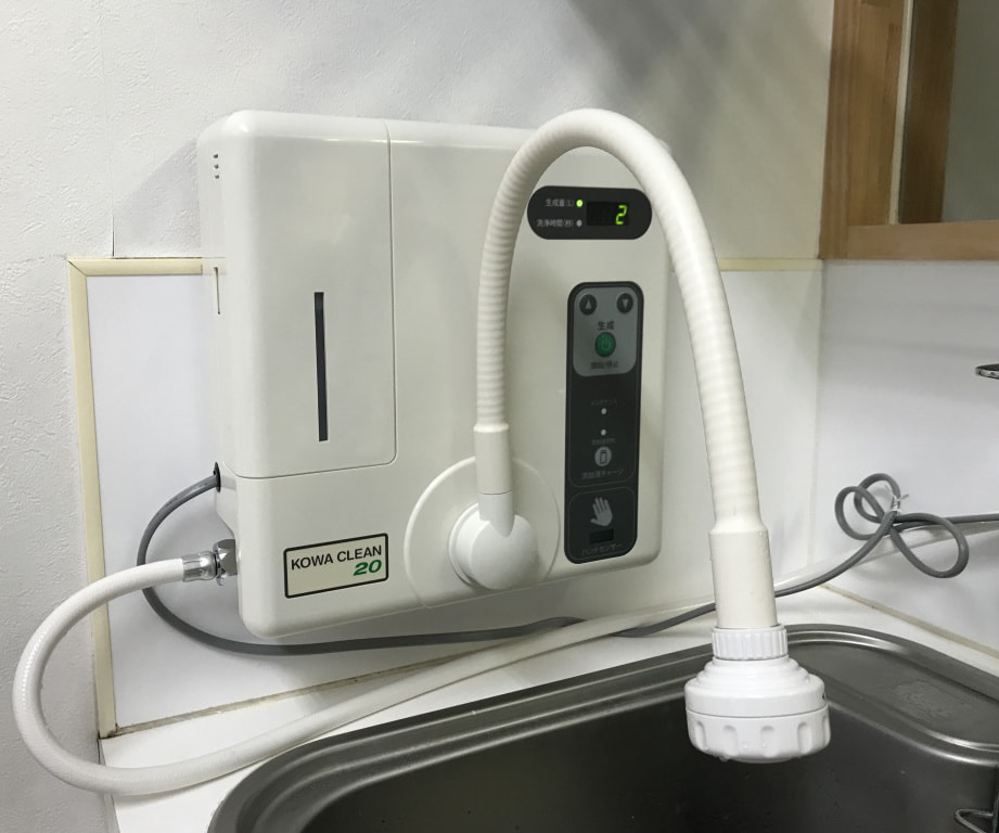 水道水に微量の食塩と塩酸を添加して電気分解することにより、洗浄除菌水を生成する小型連続式の微酸性次亜塩素酸水生成装置です。診察間の手洗い、傷の洗浄、入院ケージなどの院内設備の消毒に用いられます。当院では毎日、電解水を用いて病院内の全ての床を清掃し院内感染の防止に努めておりますので、免疫の低下した動物やワクチン未接種の子犬や子猫でも安心して来院して頂けます。2019年1月に中性水から切り替えました。