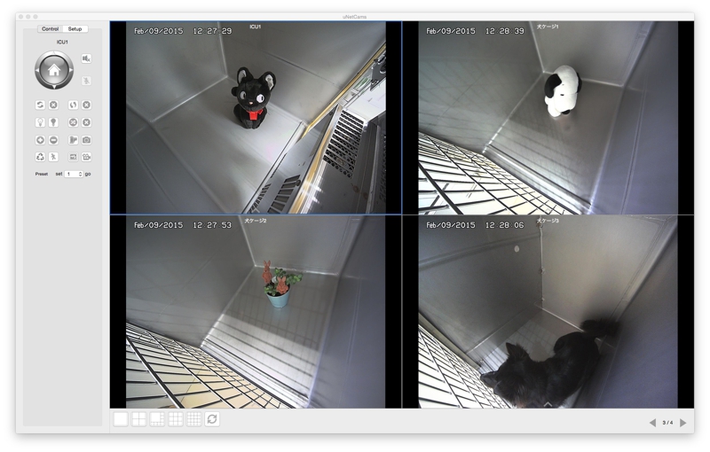 処置室内のケージにはすべての床面にヒーターが内蔵されており、側面の操作パネルでコントロール出来ます。また、ネットワークカメラが3台ケージ内に内蔵されており、入院動物の様子をモニターできるようになっています。