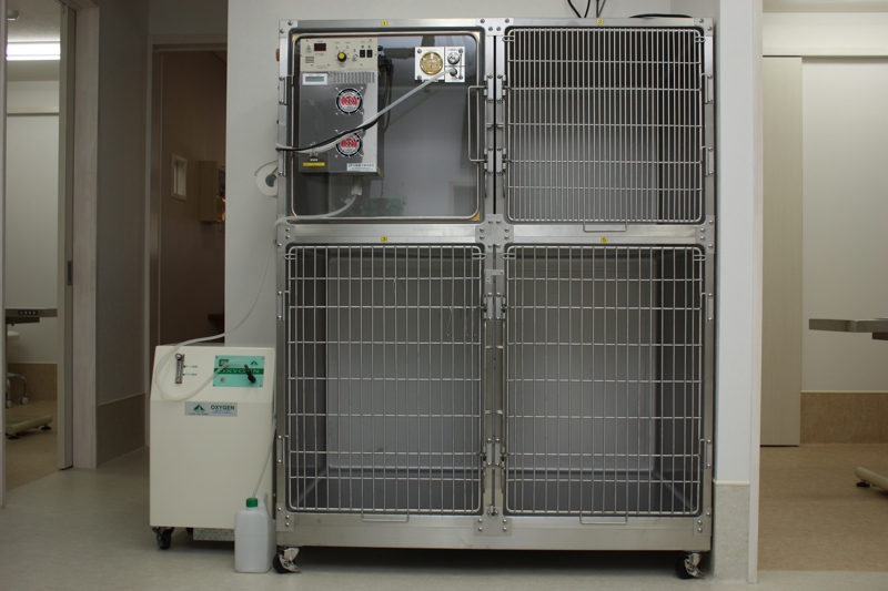 ICU装置は、普通の格子の扉の入院ケージと異なり、アクリルの密閉された扉とコンピューター制御された3室独立した空調によって温度、湿度、酸素濃度を一定に保つことが可能となっており、大型犬の収容も可能です。呼吸器疾患の動物や大きな手術の後などの集中的なケアが必要な動物において、治療の成功率を高めることが期待できます。2021夏から導入しました。