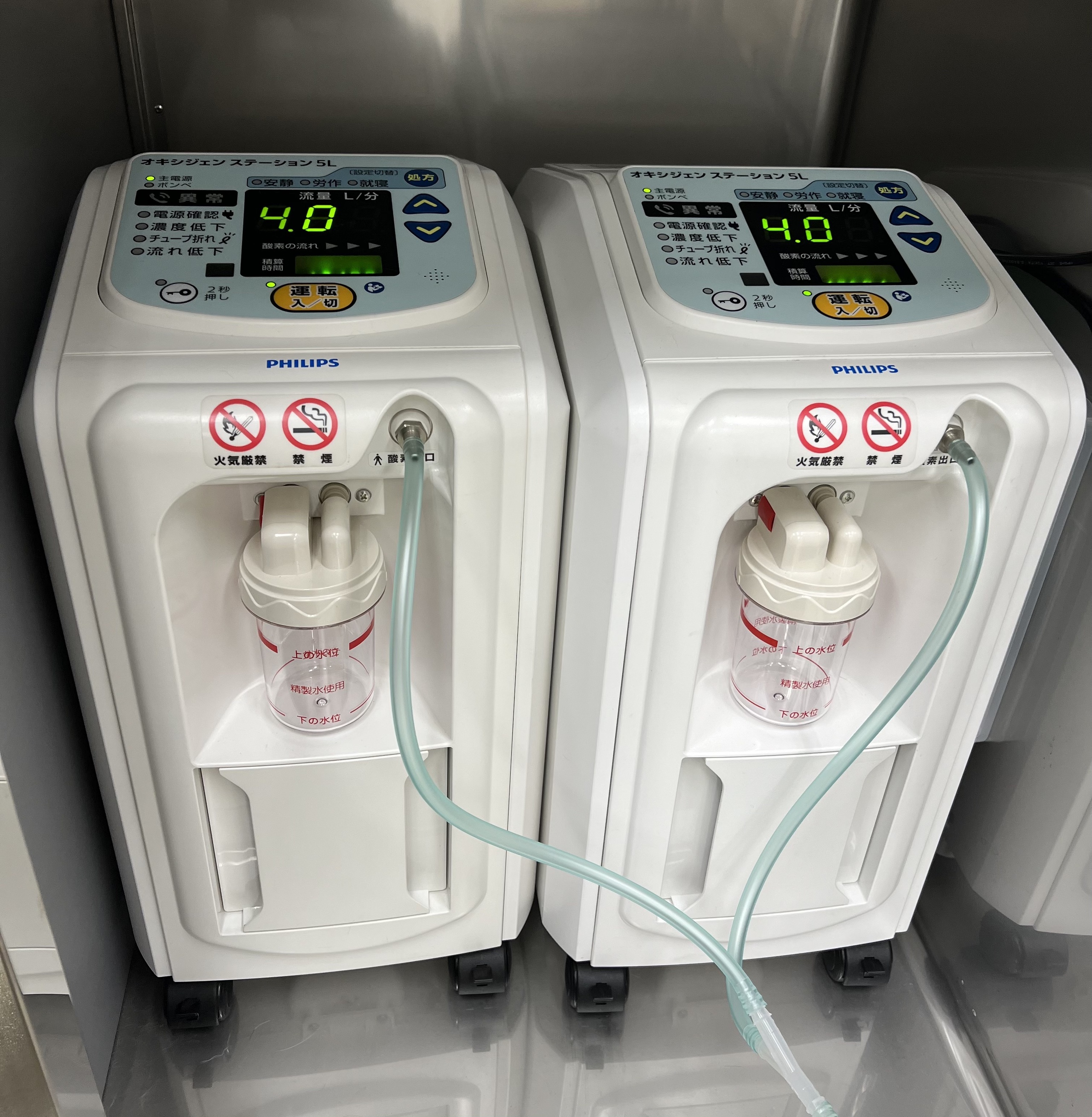 電気の力で濃縮した酸素を発生します。当院では3台の酸素濃縮機が稼働しており、複数のICUの酸素を酸素濃縮機で全て供給する事が可能です。従来通り酸素ボンベによる供給も選択可能です。