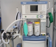 当院の麻酔器には様々な呼吸モードのオプションが組み込まれており、体の小さな動物から老齢の動物までリスクの高い麻酔においてきめ細かい呼吸管理を可能とします。気道内圧モニターや換気量モニターを内蔵しています。たとえ電力供給や酸素供給が止まっても安全機構が働いて呼吸管理を続行できます。イソフルランおよびセボフルランを選択して使用できます。