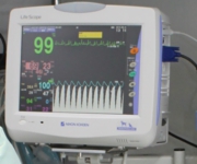 全身麻酔時の動物の心拍数、呼吸数、酸素飽和度、血圧、呼気中二酸化炭素濃度、体温、麻酔ガス濃度などをモニターします。生体情報モニターの画面は手術室の大画面モニターにも表示されており、全てのスタッフが見えるように配慮されています。当院では全身麻酔器に内蔵されている気道内圧や換気量モニターを併用しきめ細かな麻酔管理を目指しています。当院では現在この生体情報モニターが2台稼働しており、急な故障の際にもバックアップ体制は万全です。