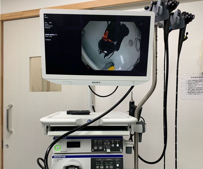 もうり動物病院では消化器内視鏡の検査処置が可能です。大型犬の十二指腸に届く直径9mmの内視鏡に加えて、猫や子犬でも実施可能な直径5.4mmの内視鏡も備えており、いずれもハイビジョン画質です。胃や食道内の異物摘出や腫瘍の生検などが適応となります。内視鏡の画像はすべてデジタル録画するように努めており、飼主様および紹介獣医師に対して情報提供できるようにしています。