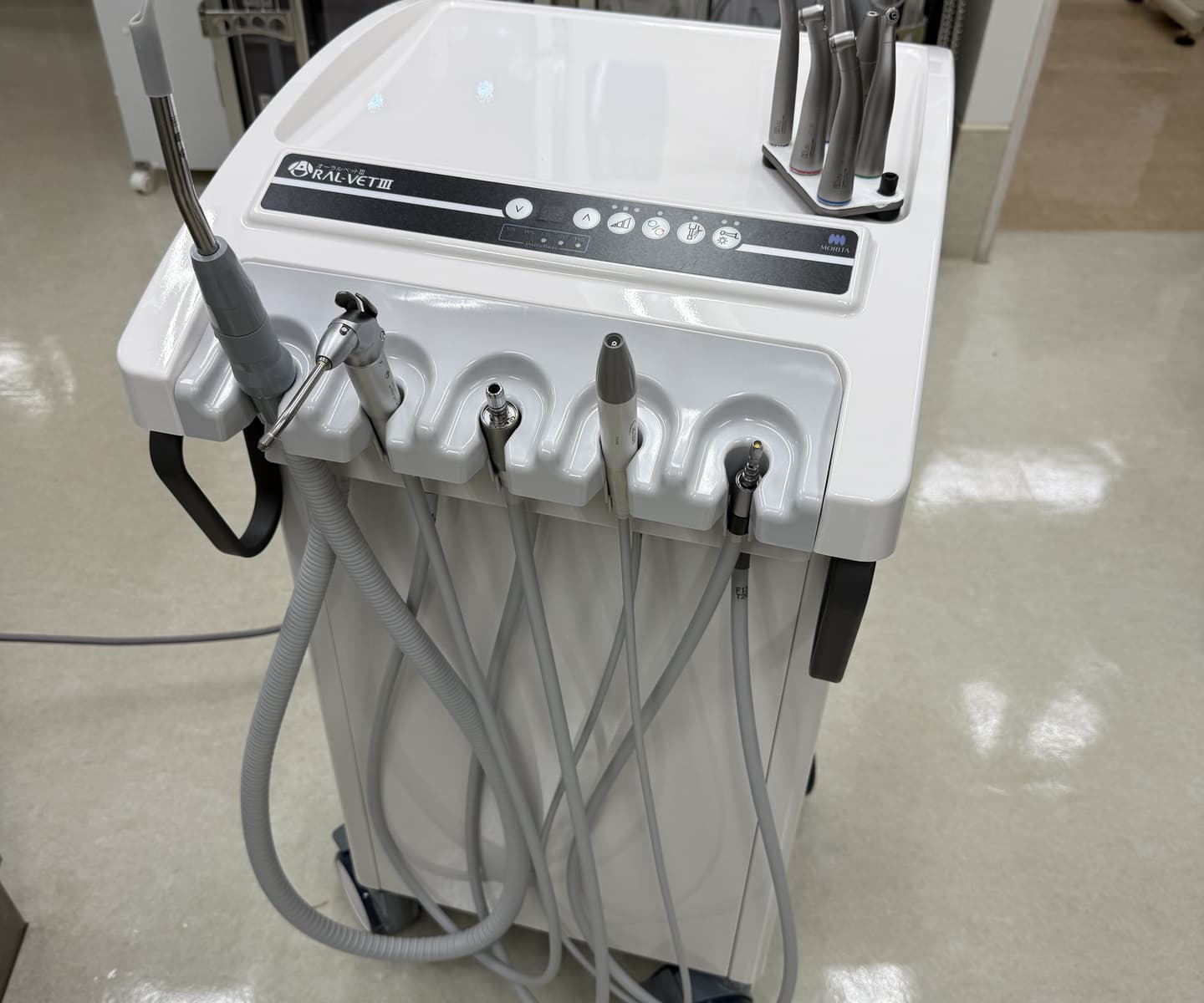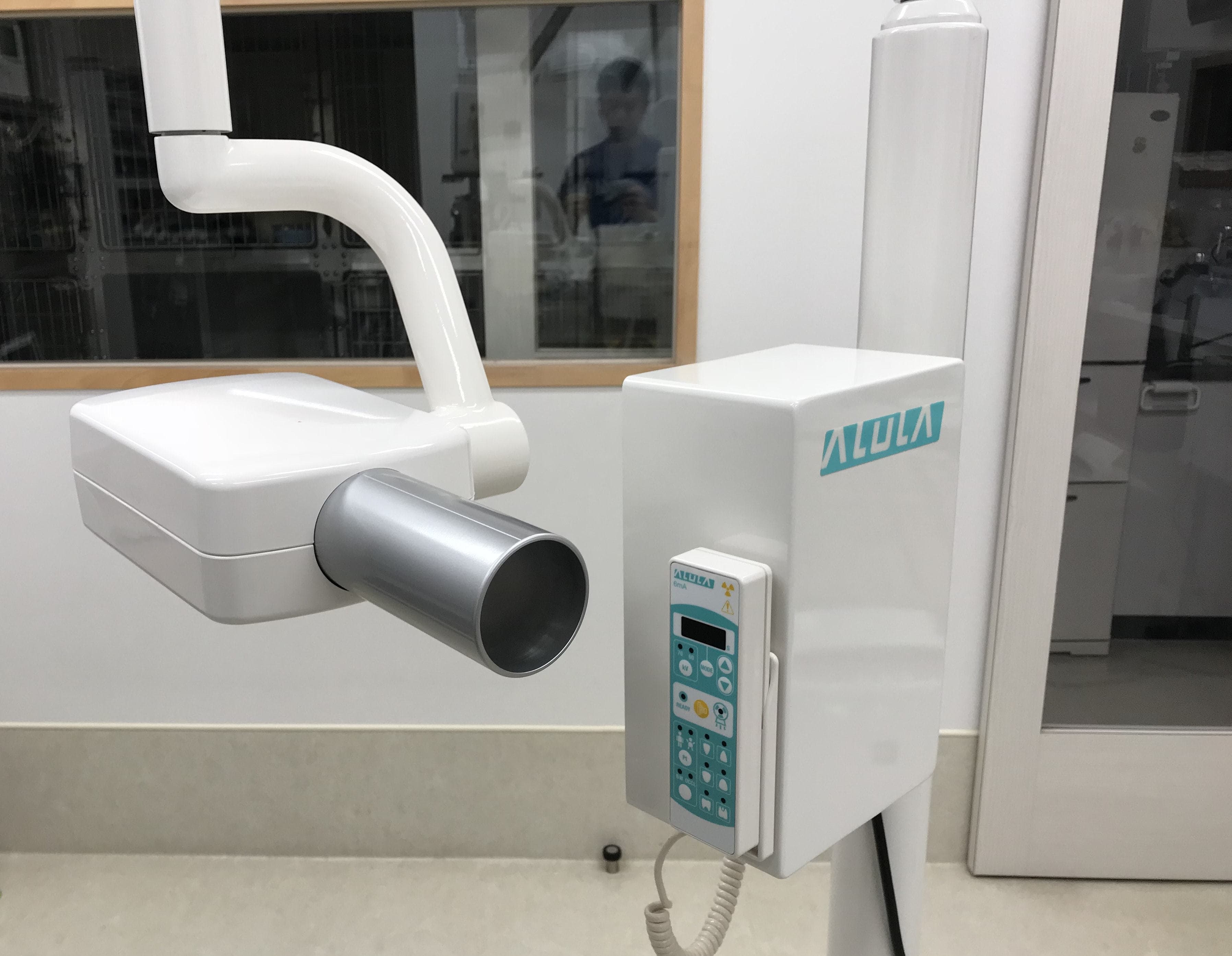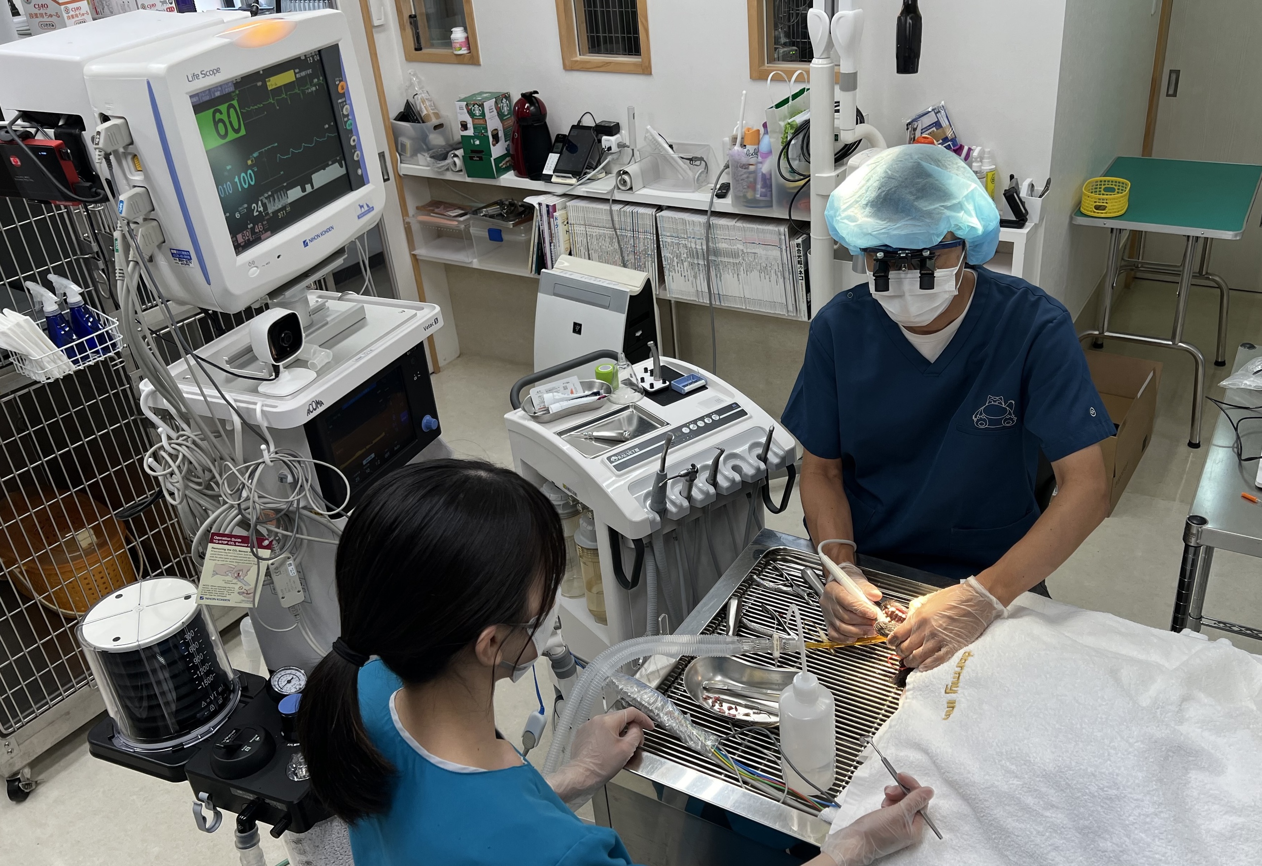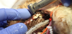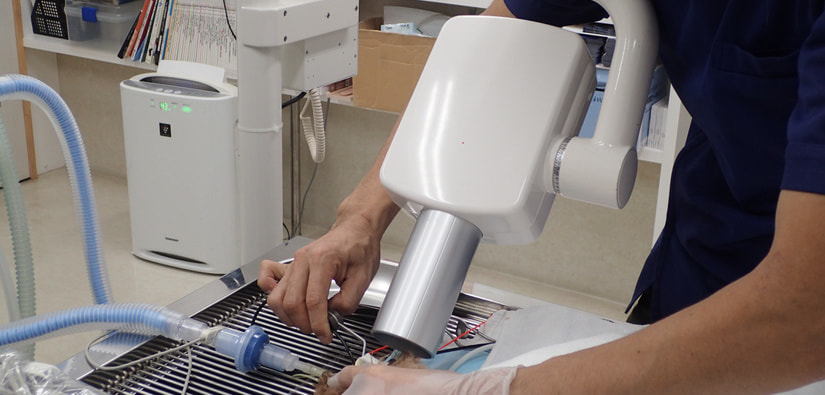 歯科処置は処置室のシンクの上で歯科・外傷処置用の麻酔器を使用して行います。まず、コーンビームCT装置と歯科用X線撮影装置を用いて歯と骨の状態を評価し、歯周病の程度を判断します。合わせて歯の動揺がないか、歯肉ポケット内の状態がどうかを調べていき、抜歯の必要があるかを判断します。超音波スケーラーで歯石を落としていきます(スケーリング)。この時、歯の熱損傷を防ぐために水しぶきが飛びますので顔の他の部位が濡れて体温が下がらないように配慮します。歯肉ポケット内の歯垢や歯石をキュレットで除去し、不正な肉芽を除去します。抜歯が必要であれば必要に応じてマイクロエンジンを使って歯を切断・分割して抜歯します。