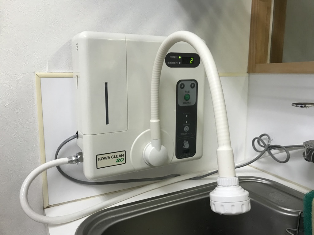 水道水に微量の食塩と塩酸を添加して電気分解することにより、洗浄除菌水を生成する小型連続式の微酸性次亜塩素酸水生成装置です。診察間の手洗い、傷の洗浄、入院ケージなどの院内設備の消毒に用いられます。当院では毎日、電解水を用いて病院内の全ての床を清掃し院内感染の防止に努めておりますので、免疫の低下した動物やワクチン未接種の子犬や子猫でも安心して来院して頂けます。2019年1月に中性水から切り替えました。
