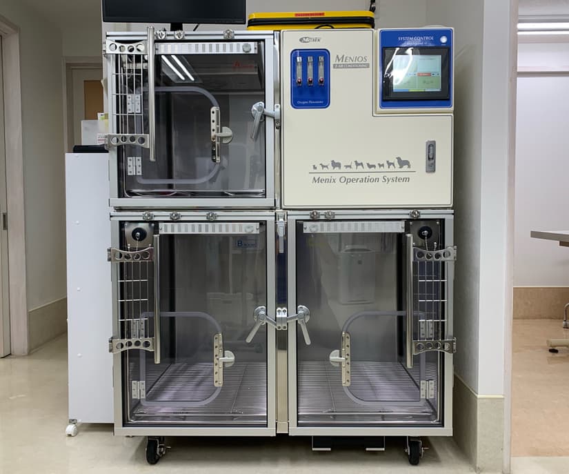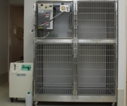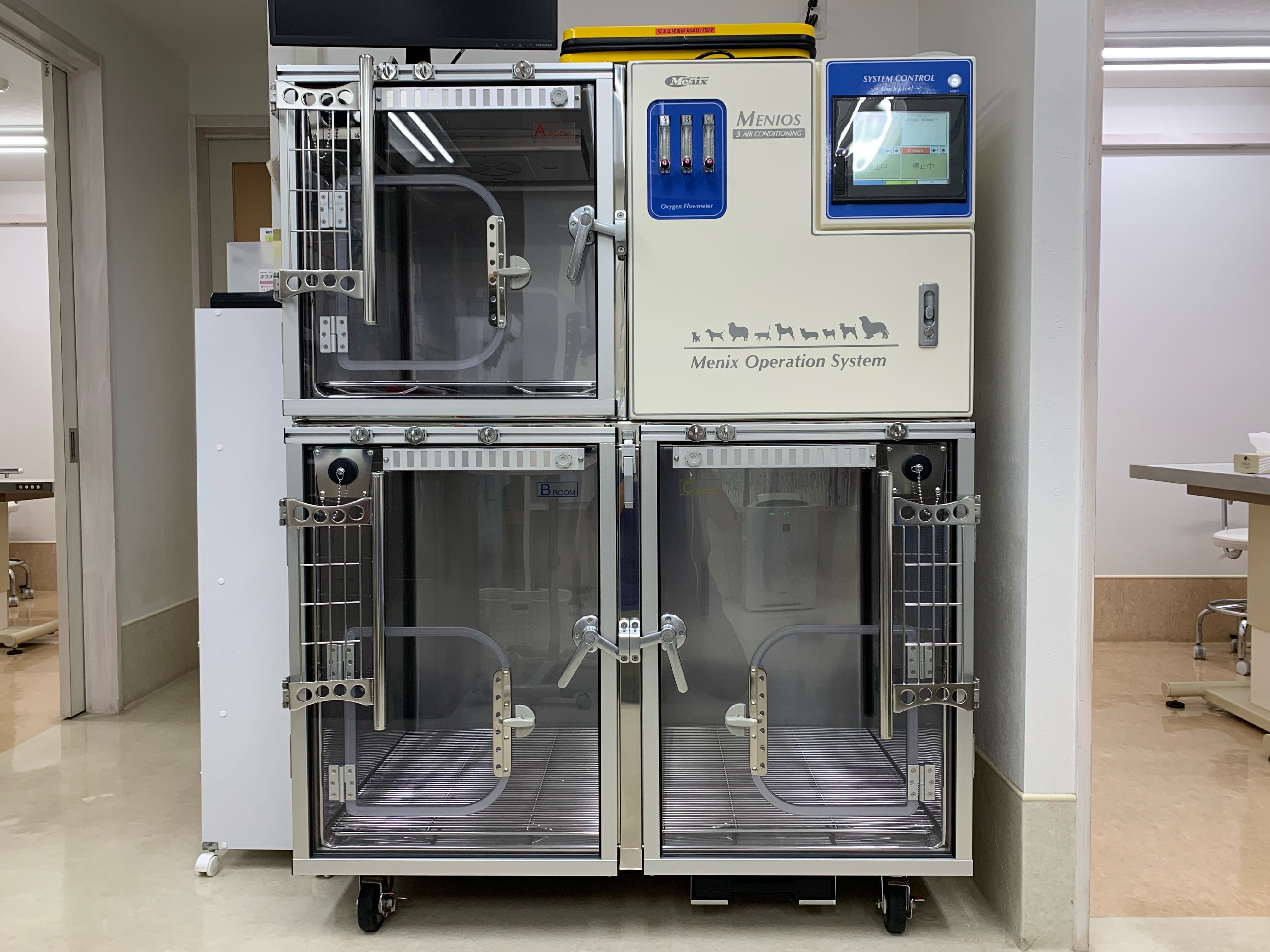 ICU装置は、普通の格子の扉の入院ケージと異なり、アクリルの密閉された扉とコンピューター制御された3室独立した空調によって温度、湿度、酸素濃度を一定に保つことが可能となっており、大型犬の収容も可能です。呼吸器疾患の動物や大きな手術の後などの集中的なケアが必要な動物において、治療の成功率を高めることが期待できます。2021夏から導入しました。