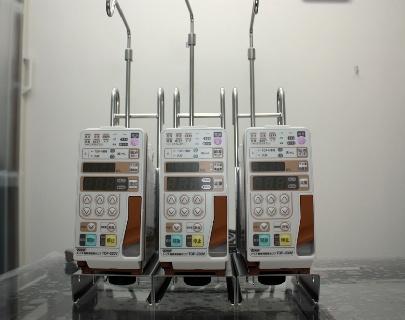 静脈内点滴は重要な治療ですが、スピードや量によっては弊害を生じることがあります。当院には動物専用の輸液ポンプを5台備えており点滴の総量やスピードを厳密に管理することができます。