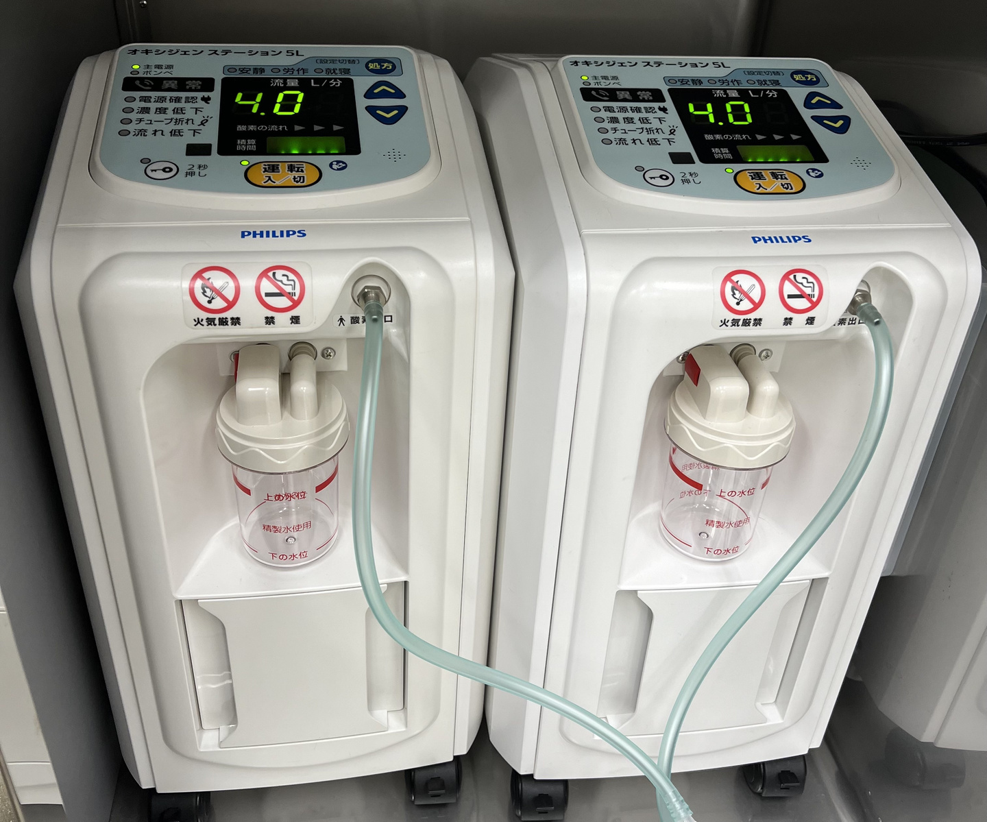 電気の力で濃縮した酸素を発生します。当院では3台の酸素濃縮機が稼働しており、複数のICUの酸素を酸素濃縮機で全て供給する事が可能です。従来通り酸素ボンベによる供給も選択可能です。
