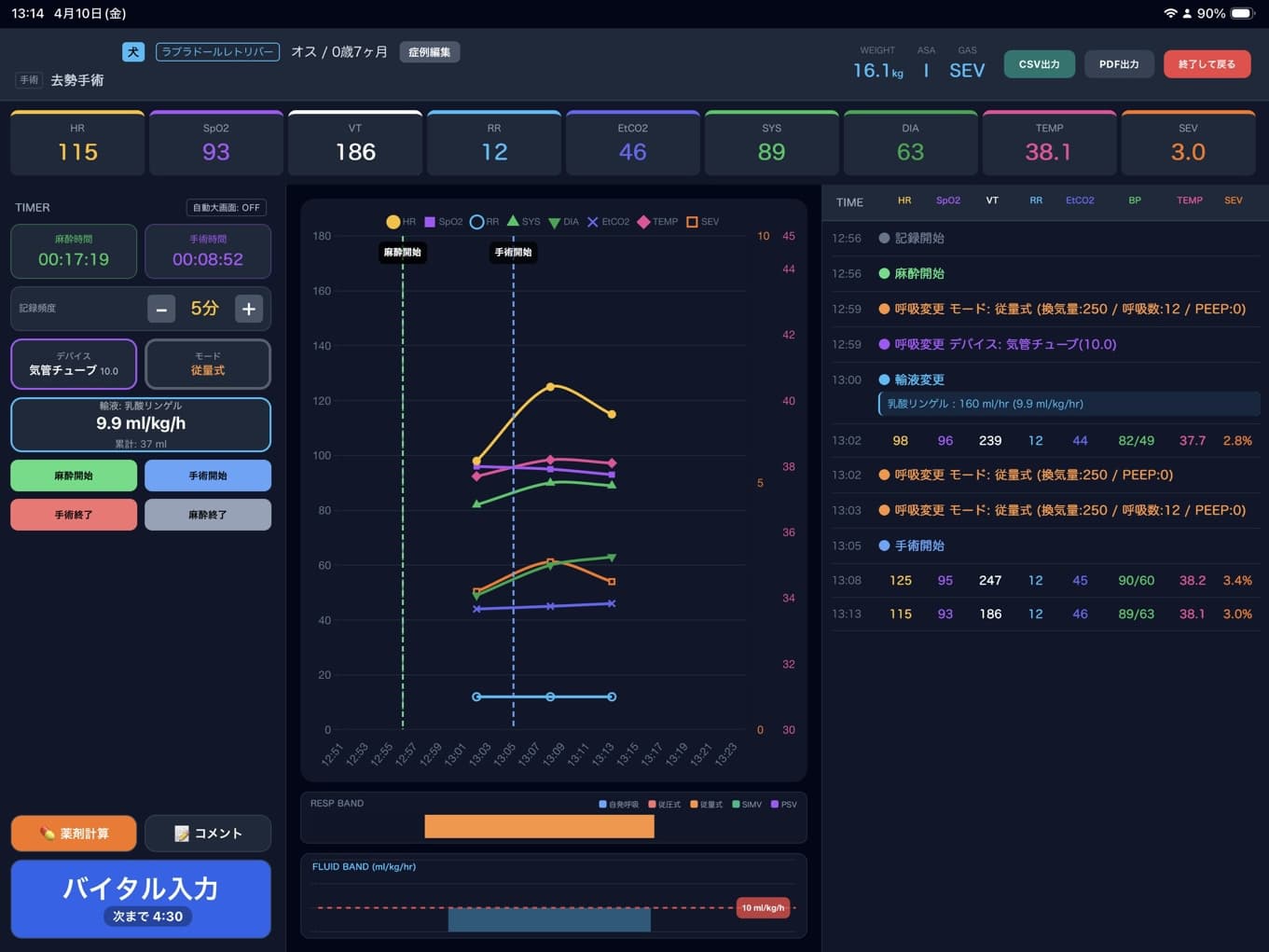 従来、時計を見ながら紙に手書きしていたバイタルサインを、タブレットの正確なタイマー機能を用いて効率的に入力できます。さらに、様々な麻酔イベントや記録をタイムラインとして記録し、薬剤の使用量を登録してカスタマイズすることで、薬剤量やCRIの計算もこなします。記録後には美しいグラフや術中の写真と統合した完成度の高い手術麻酔記録をPDFとして出力することが可能です。