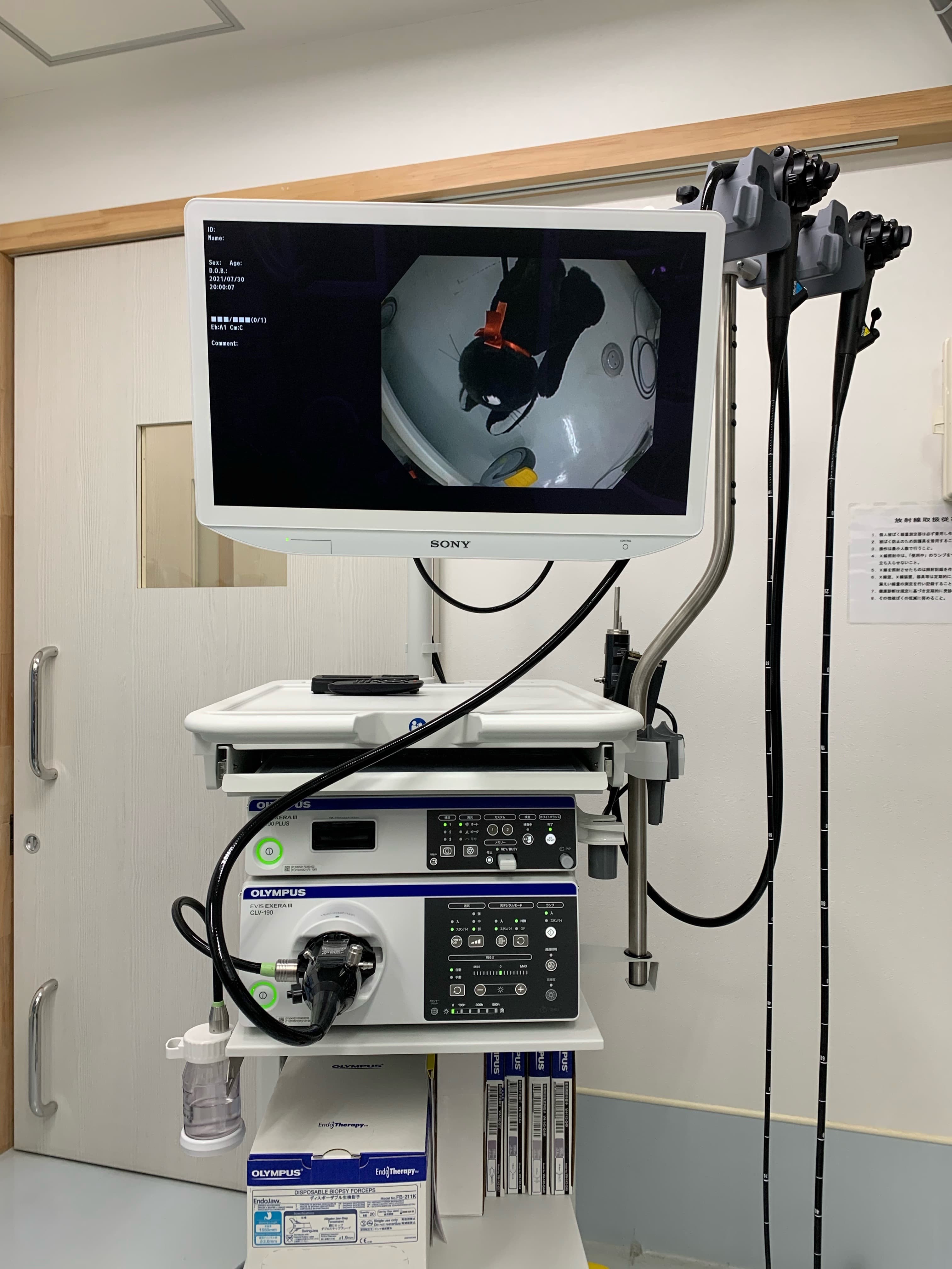 もうり動物病院では消化器内視鏡の検査処置が可能です。大型犬の十二指腸に届く直径9mmの内視鏡に加えて、猫や子犬でも実施可能な直径5.4mmの内視鏡も備えており、いずれもハイビジョン画質です。胃や食道内の異物摘出や腫瘍の生検などが適応となります。内視鏡の画像はすべてデジタル録画するように努めており、飼主様および紹介獣医師に対して情報提供できるようにしています。