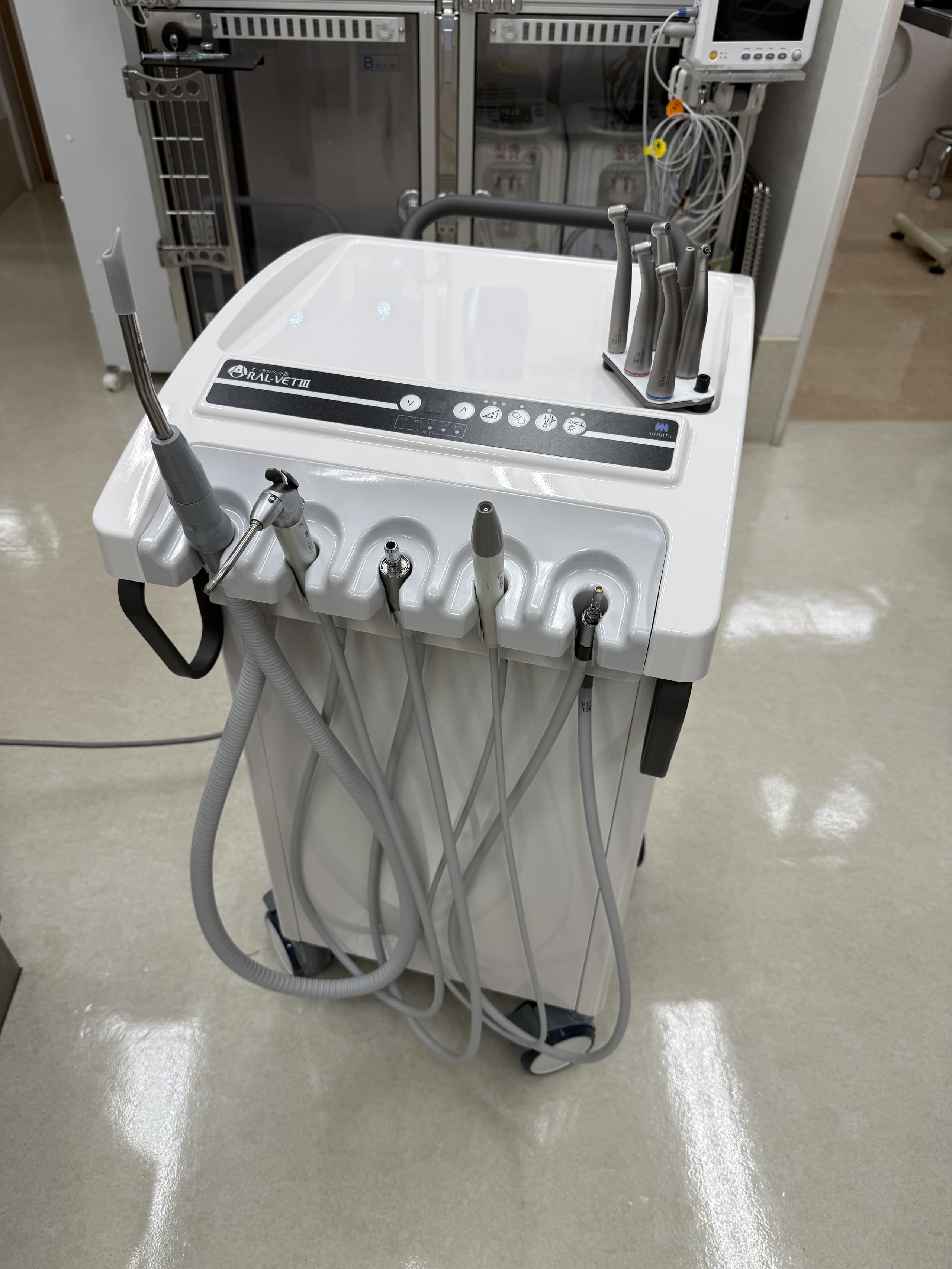 通常のラウンドバーに加えて歯科処置専用のハンドピースを採用しています。椎間板ヘルニアなどの骨を削る手術や、スケーリングの後の歯の研磨やフッ素コーティング、歯周病の為に抜歯が必要な歯の切断などに効果を発揮します。