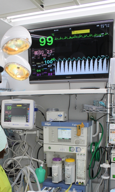 手術室において全身麻酔時の動物の心拍数、呼吸数、酸素飽和度、血圧、呼気中二酸化炭素濃度、体温、麻酔ガス濃度など、基本的な項目に加えて換気量やPVループなど呼吸状態も可視化してモニターできるハイスペック機です。生体情報モニターの画面は手術室の大画面モニターにも表示されており、手術中、全てのスタッフが見えるように配慮されています。2026年2月に導入しました。